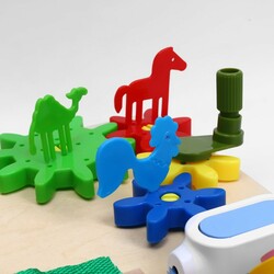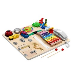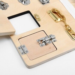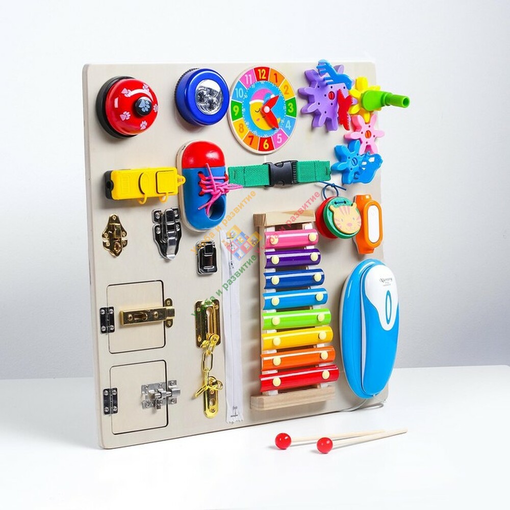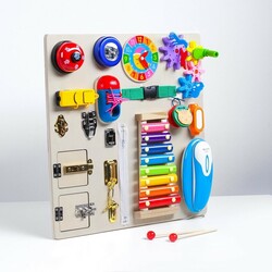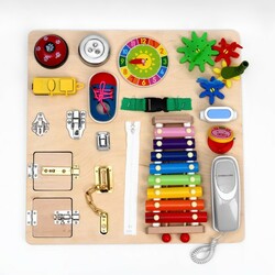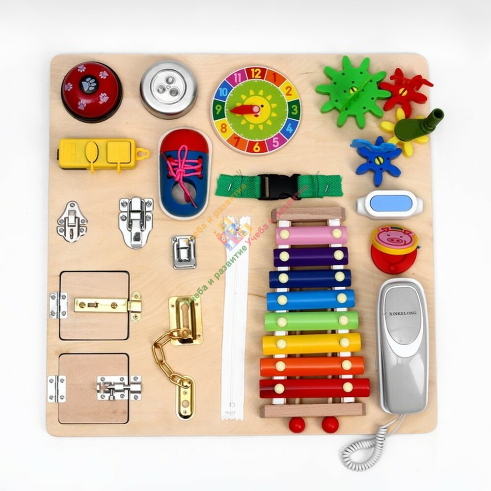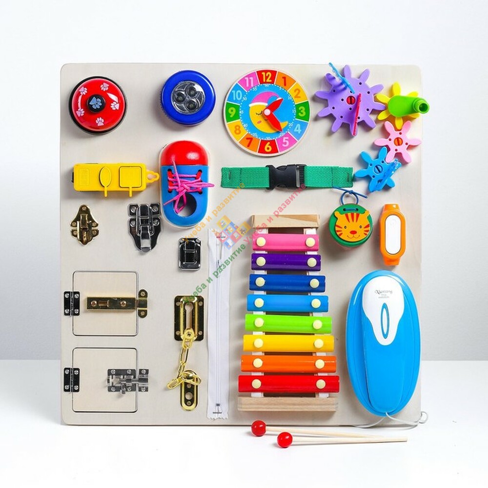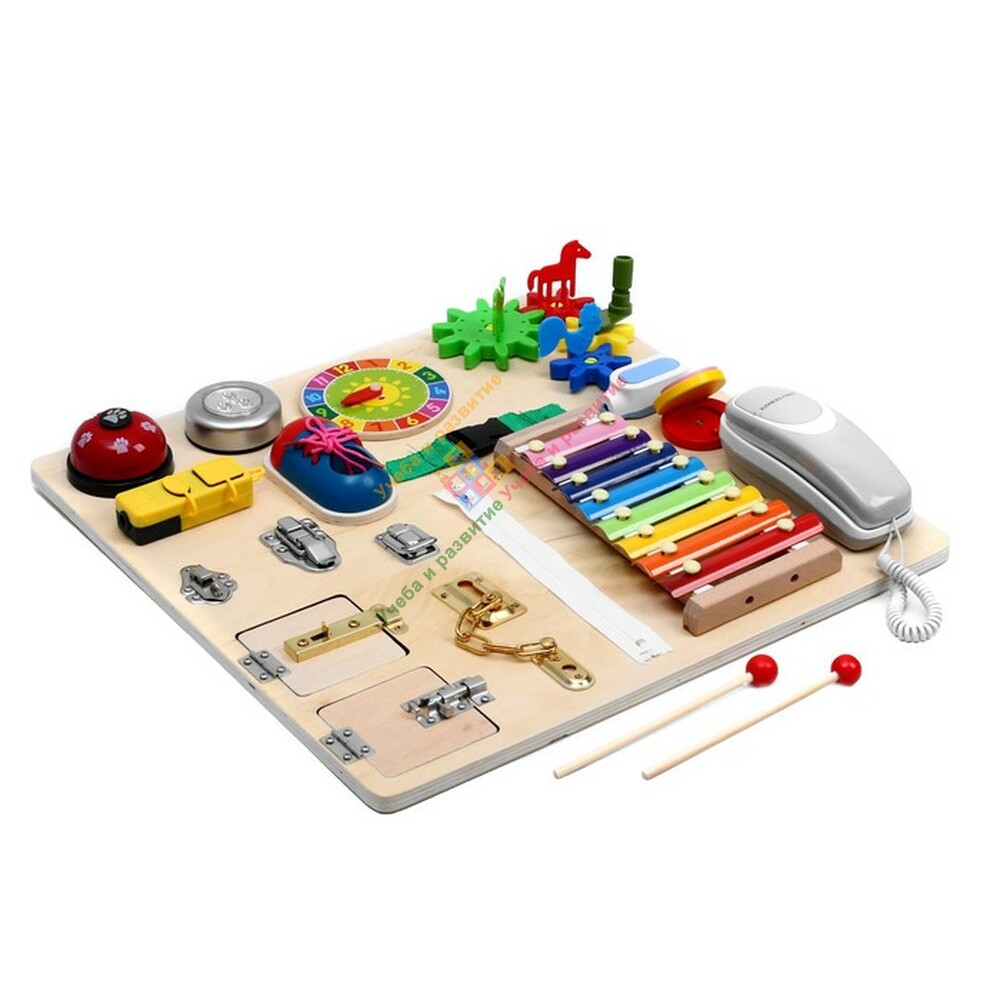 - Состав бизиборда: Шнуровка. Металлофон. Шестерёнки. Щеколда. Молния