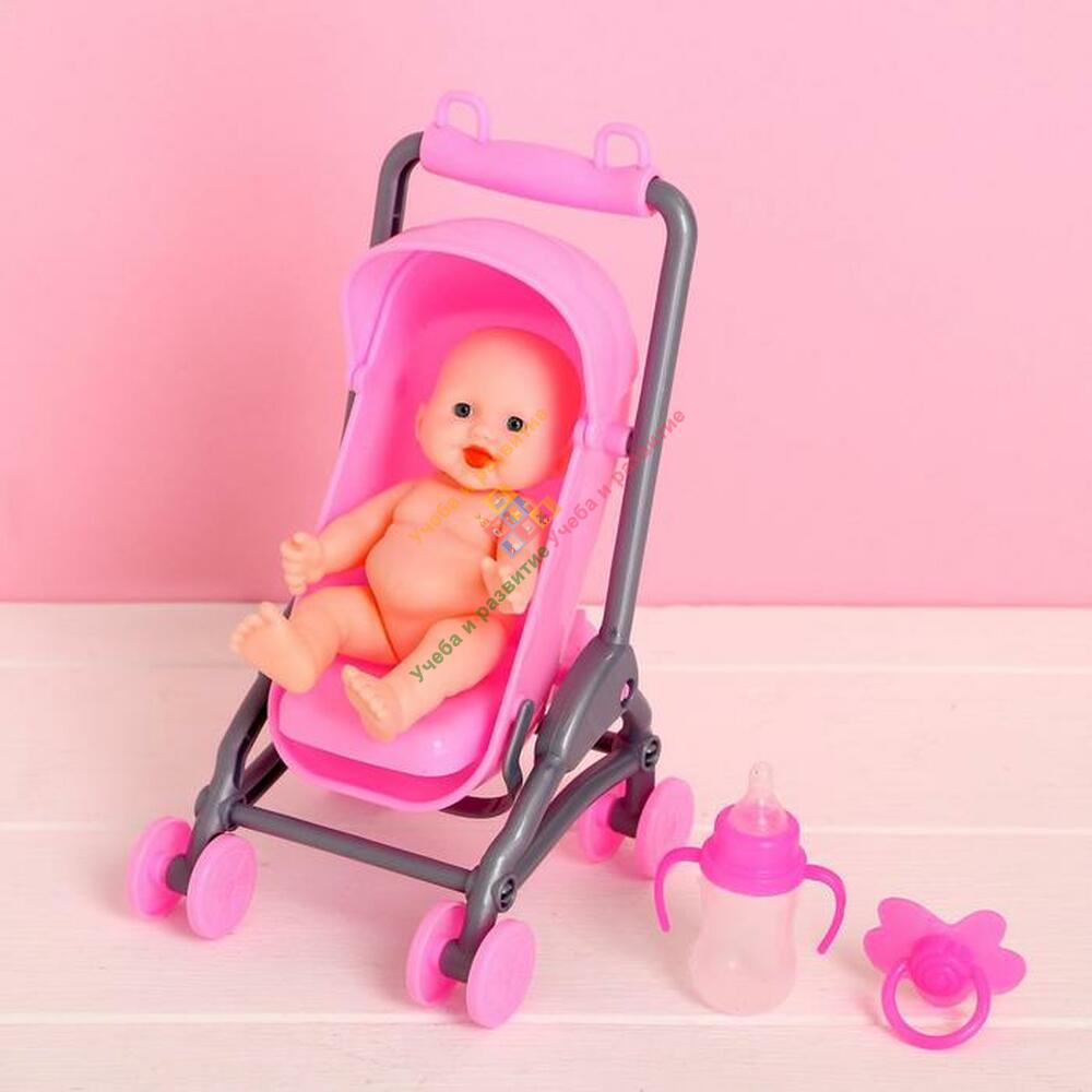 В комплекте есть аксессуары для весёлой игры: коляска, бутылочка и соска.