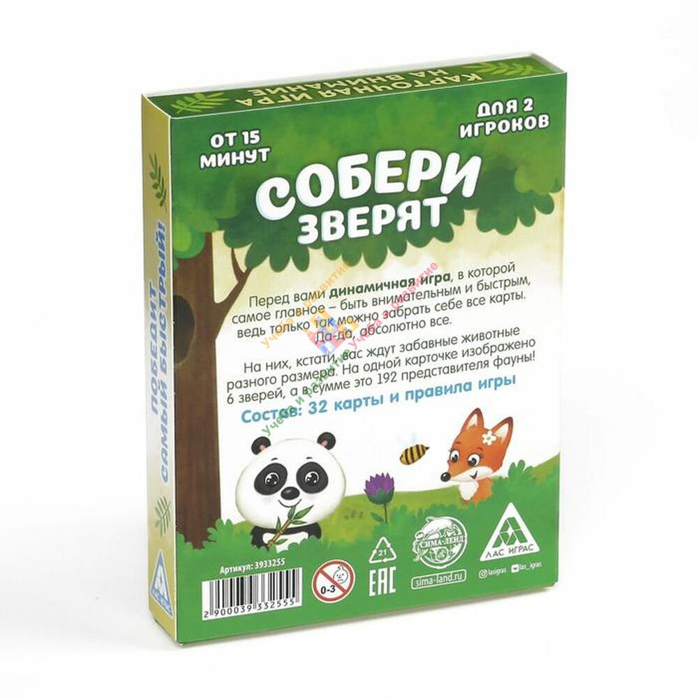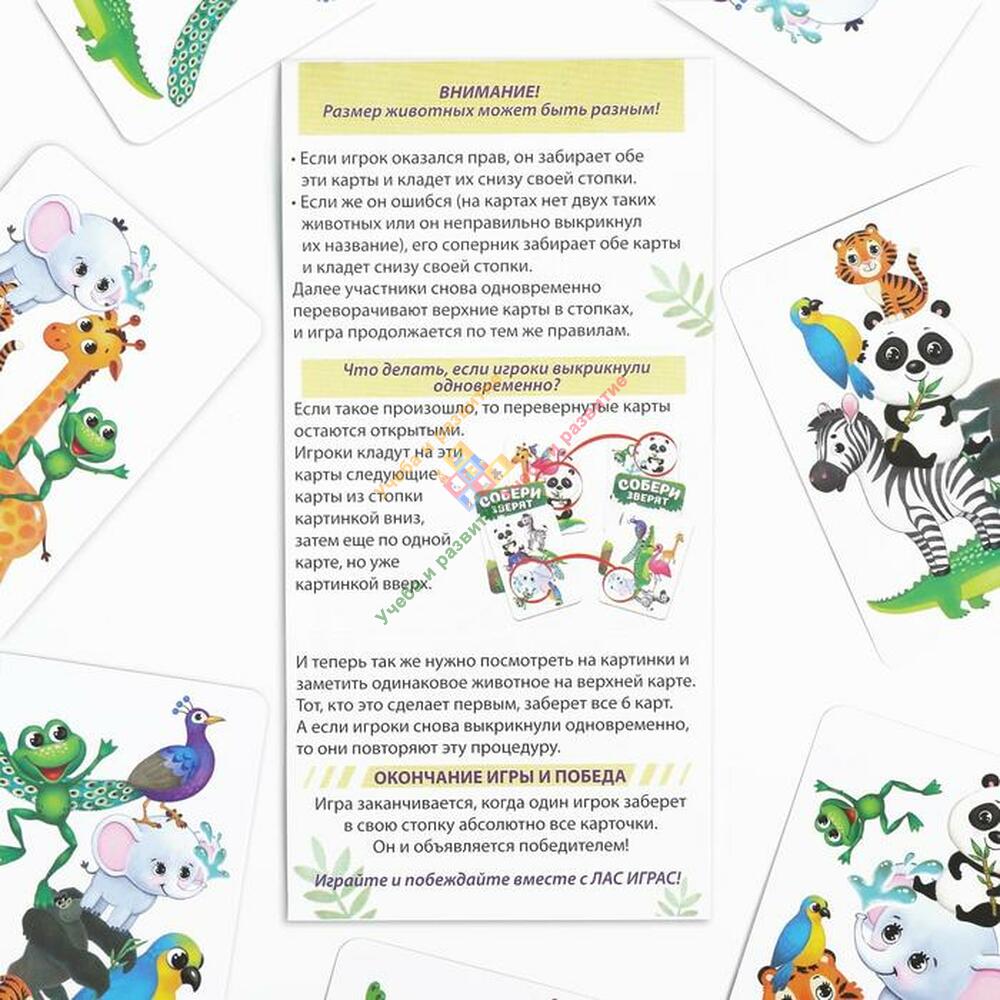 А теперь снова и снова переворачивайте карты и ищите одинаковых зверей (ну и что, что они могут разного размера, это значения не имеет!). Продолжайте до тех пор, пока соперник не останется без карточек. Так и произошло? Значит, вы победили!