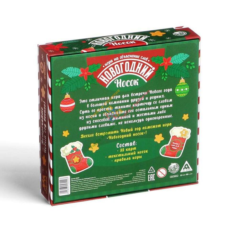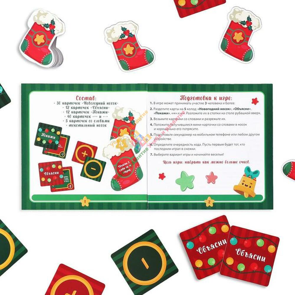 Вытягивайте карточку «носок», на которой написано количество слов и время для их объяснения, а дальше доставайте карты со словами и попробуйте сделать так, чтобы вас поняли. Чувствуете себя уверенно?! Добавьте в игру карточки «объясни» и «покажи». Например, попробуйте изобразить слово «борода из ваты», стоя с завязанными глазами. Для удобства подсчета победных баллов в набор входят карточки «+» и «-». В конце игры подсчитайте ваши баллы и определите победителя!