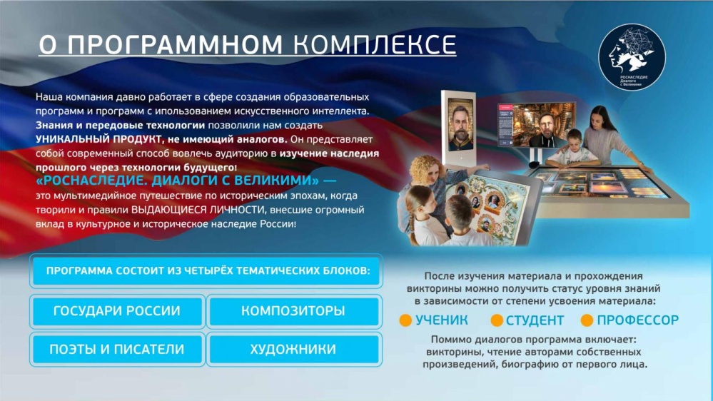 В программе "Роснаследие. Диалоги с Великими" пользователи общаются в режиме реального времени с историческими личностями, внесшими вклад в культурное и историческое наследие России. Помимо диалогов, программа включает викторины, биографию от первого лица и чтение авторами собственных произведений.