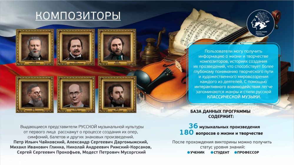 - Позволяет школьникам и взрослым напрямую общаться с анимированными образами П.И. Чайковского, Н.А. Римского-Корсакова, М.П. Мусоргского, С.С. Прокофьева и А.С. Даргомыжского. Композиторы делятся историями жизни, творчества и представляют 36 ключевых произведений мировой классики для прослушивания и изучения.