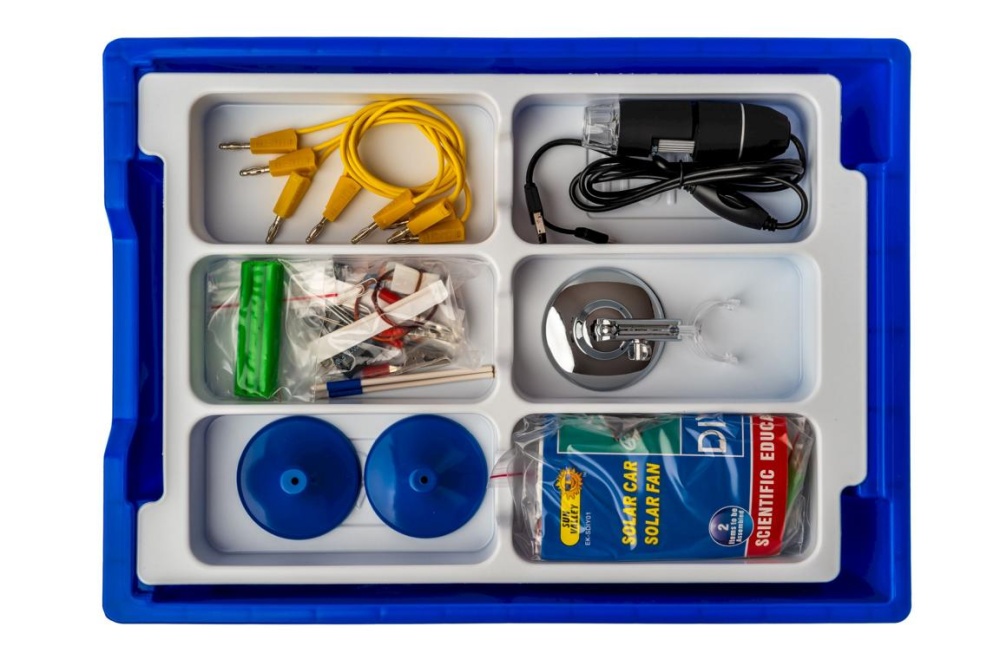 • Батарейный блок, лампы, конденсаторы, светодиод, элементы питания, универсальные зажимы, зажимы типа «крокодил», провода