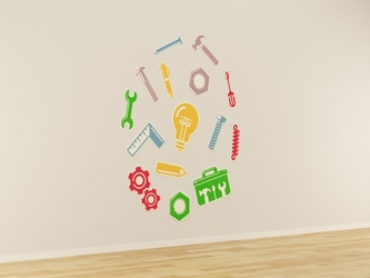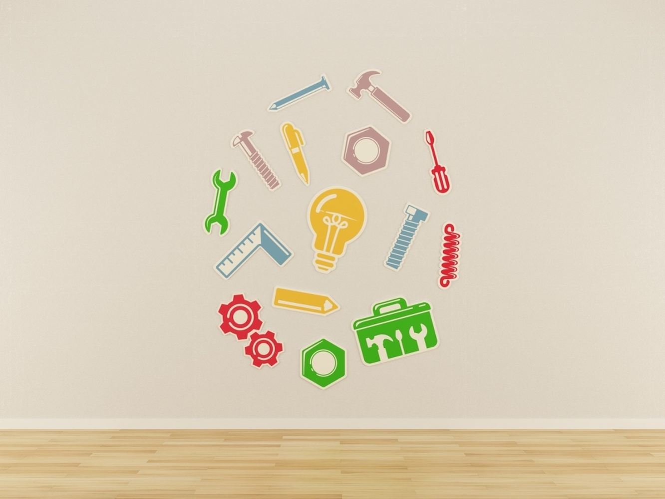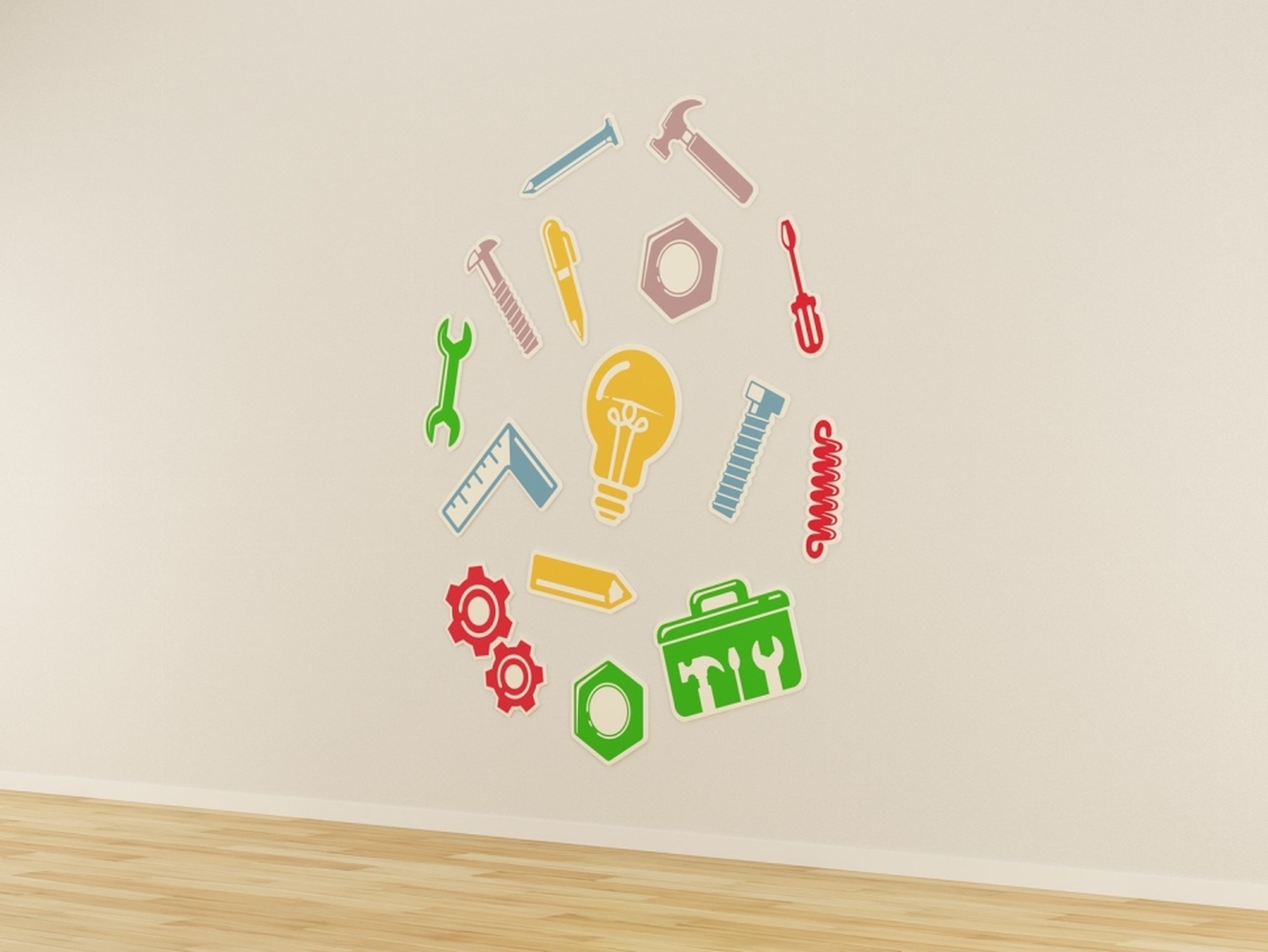 Набор ярких декоративных панелей, оформленных в тематике технического творчества и конструирования. Каждая панель выполнена в виде узнаваемых инструментов и деталей, используемых на занятиях по конструированию: молотка, отвертки, гаек, болтов, шестеренок, пружин, линейки и других элементов. Изображения стилизованы, но легко узнаваемы, что помогает детям ориентироваться в инструментах и развивает интерес к инженерному труду. Изготовлены из качественных, безопасных материалов с гладкой окрашенной поверхностью, которую легко очищать влажной тряпкой. Панели украшают помещение, создают творческую атмосферу и формируют интерес к работе руками.