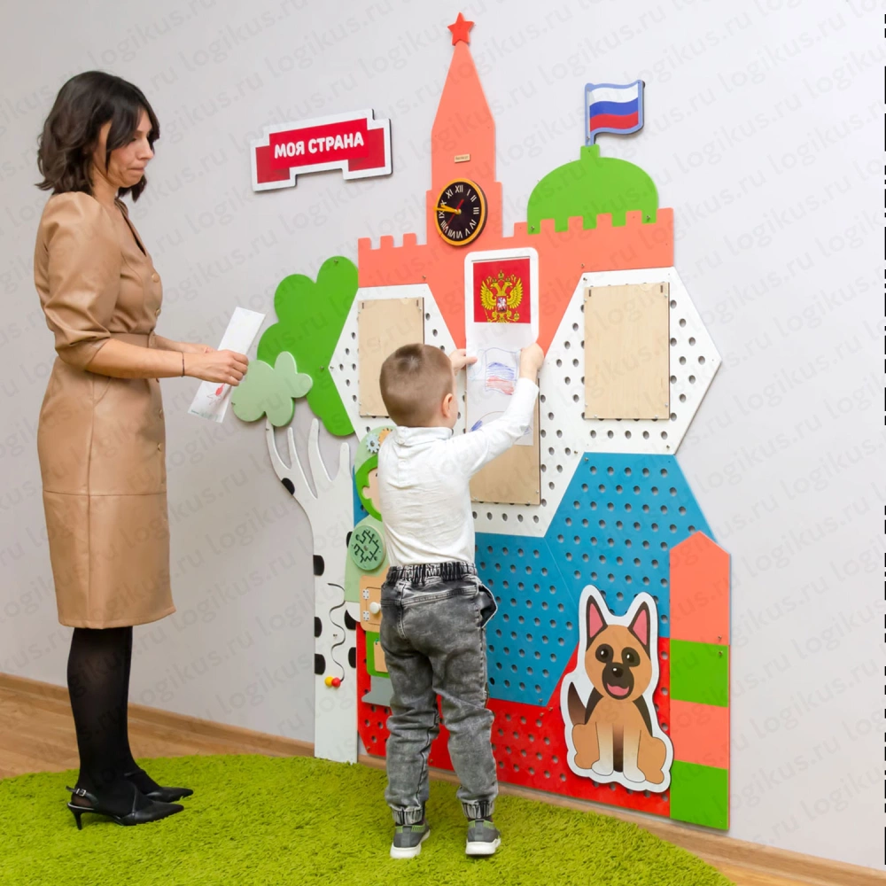 Комплект панелей оптимального размера — 160 см в ширину. Его можно разместить в коридоре, холле детского сада даже при недостатке свободного места. Каждый день проходя мимо патриотического уголка, играя с подвижными элементами бизибордов, дети запоминают государственную символику, цвета, понятия о малой и большой Родине.